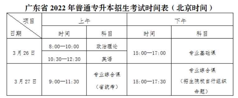 (五)普通专升本招生考试时间为2022年3月26日(星期六)至27日(星期日)两天,具体安排见下表: