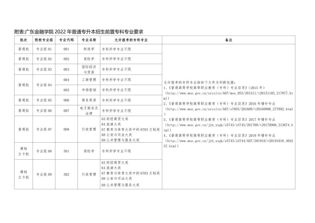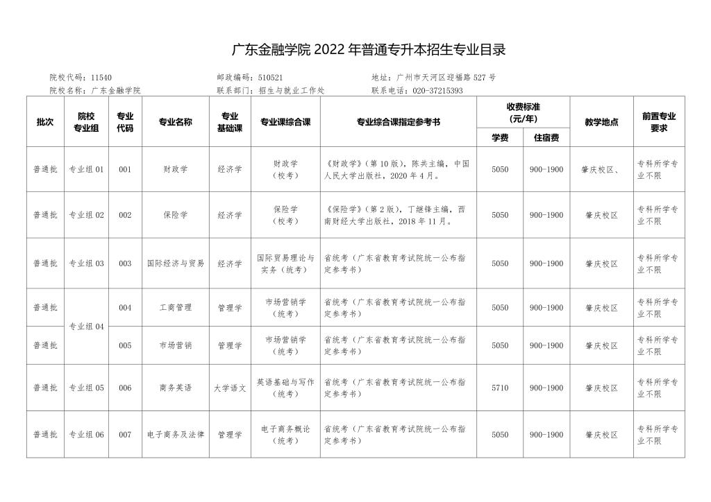 我校2022年普通专升本招生专业为财政学、保险学、国际经济与贸易、工商管理、市场营销、商务英语、电子商务及法律、行政管理等8个专业,其中,保险学和行政管理专业设置建档立卡批次计划。各专业招生批次、考试科目、教学地点、前置专科专业要求详见附件《广东金融学院2022年普通专升本招生专业目录》,招生计划数由广东省招生办公室确定后另行公布。