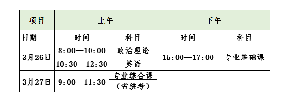 (二)普通专升本招生考试时间为2022年3月26日(星期六)至27日(星期日)两天,具体安排见下表: