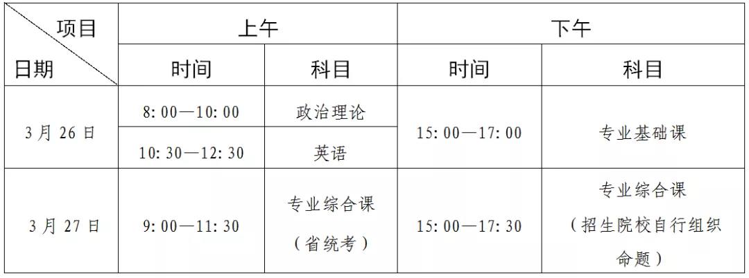 (五)普通专升本招生考试时间为2022年3月26日(星期六)至27日(星期日)两天,具体安排见下表: